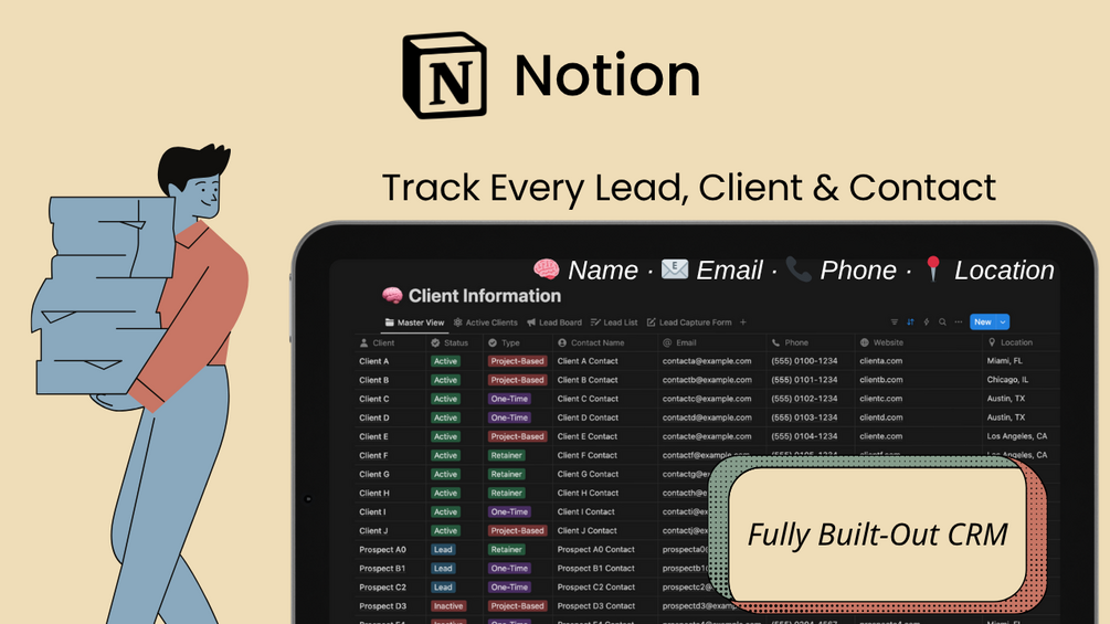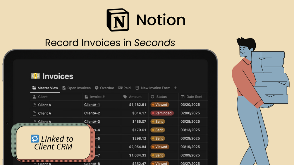 The Client CRM & Invoicing Hub gives you everything you need to manage client relationships, track leads, and send invoices — without needing multiple apps or spreadsheets.