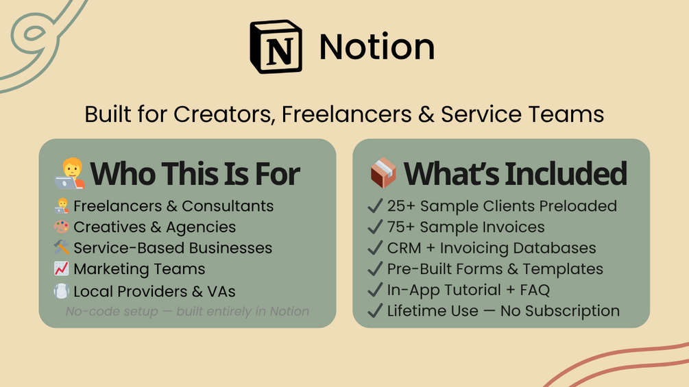 Manage leads, clients, and invoices with ease in this all-in-one Notion workspace. Built for freelancers, agencies, and service businesses.
